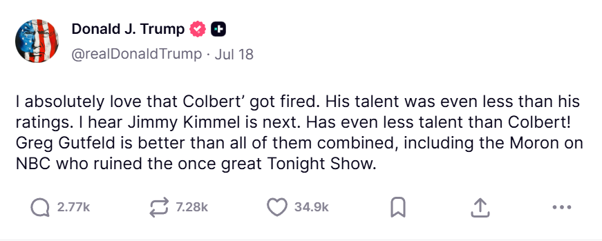 Seit dem Amtsantritt des neuen US-Präsidenten haben Late-Night-Shows einen neuen Gegner: Donald J. Trump und dessen Loyalisten. Trump ist mit dem Versprechen zur Wahl angetreten, dass er die Meinungsfreiheit in den USA verbessern wolle. Wie Reporter ohne Grenzen berichtet, hat sich die Lage aber seit seinem Amtsantritt verschlechtert. Das gilt nicht nur für Journalist*innen, sondern auch für Late-Night Hosts mit ihrer politischen Satire. Als Stephen Colbert im Juli 2025 bekannt gegeben hat, dass CBS seine Show im Mai 2026 nach der nächsten Staffel beenden wird, reagierte Trump auf Truth Social wie folgt: