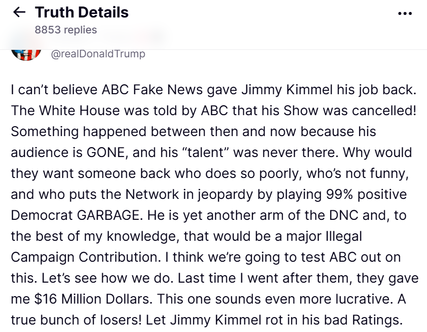 Hat sich hier Trumps Vorhersage bewahrheitet oder besser gesagt, ist der Sender ABC seinen Forderungen gefolgt? Nein, dank der großen Empörung in der Öffentlichkeit und dem Druck auf ABC und Disney (dem der Sender gehört), war Kimmel bereits am 23. September wieder abends live zu sehen. Und ja, darüber hat sich Trump auf Truth Social auch aufgeregt.